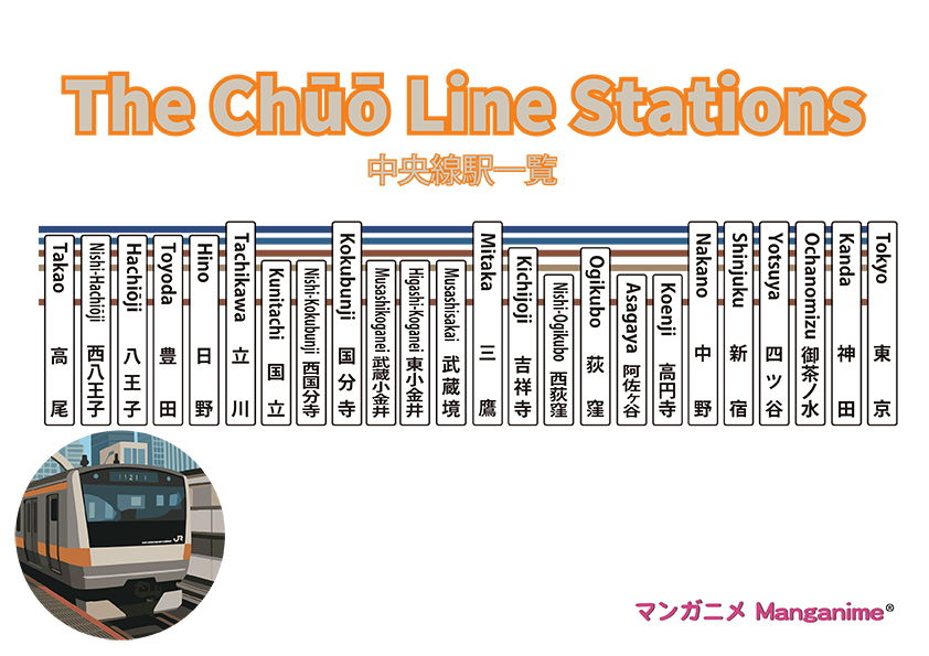 The Chūō Line is the guide and business name for the train line on JR East’s Chūō Line that runs from Tokyo Station in Chiyoda Ward, Tokyo to Takao Station in Hachioji City. Some route maps and other guides show the line as running to Otsuki Station in Otsuki City, Yamanashi Prefecture.